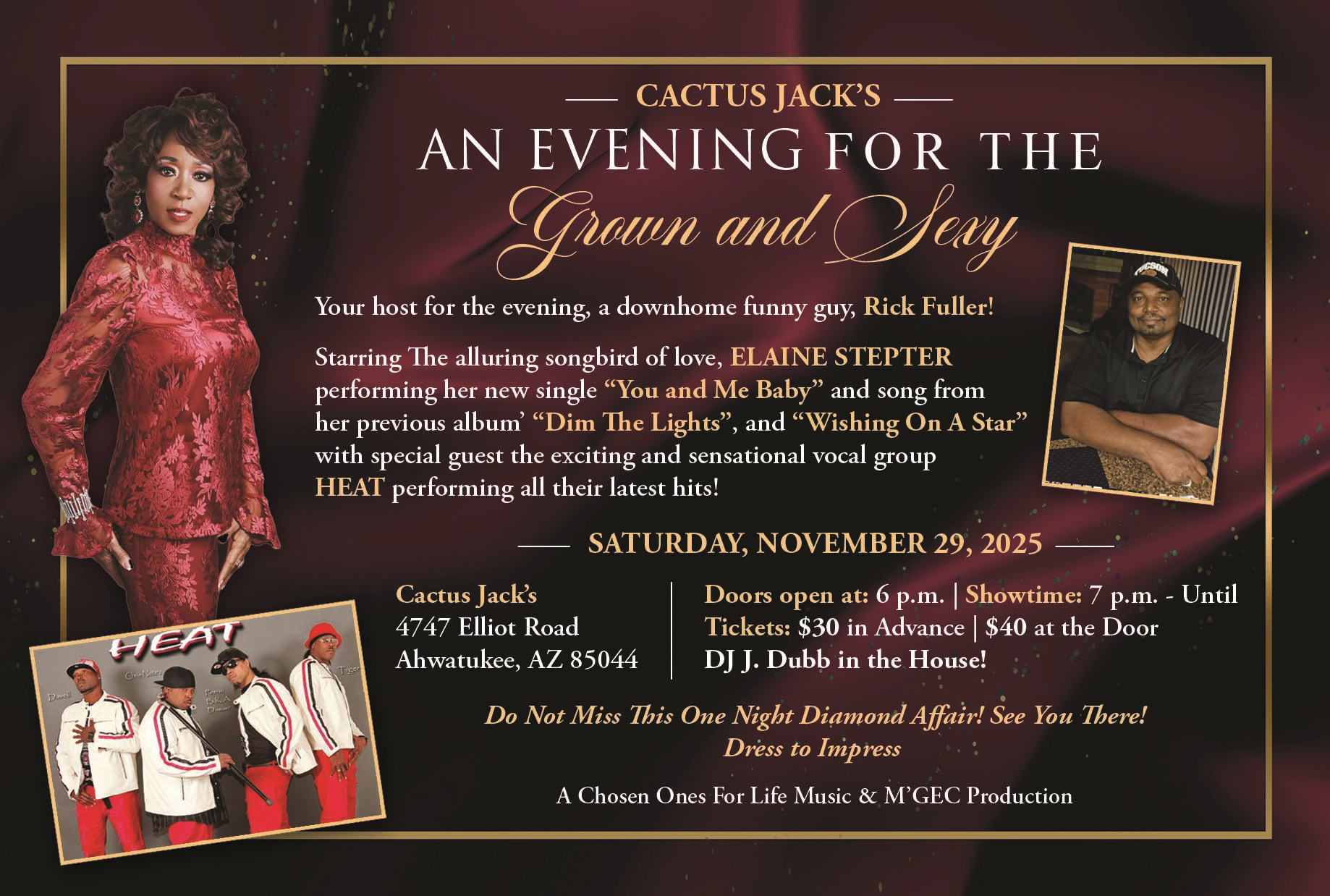 Get ready for a night of smooth sounds, soulful vibes, and pure class! Join Elaine Stepter – The Songbird of Love for An Evening for the Grown & Sexy — a live performance filled with great music, energy, and unforgettable entertainment. Don’t miss this one-of-a-kind event celebrating music, love, and good vibes with one of the valley’s most captivating voices.